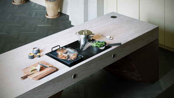 Das matte Kochfeld von BORA fügt sich harmonisch in das moderne Küchendesign ein und sorgt mit dem integrierten Abzug für freie Sicht und ruhige Linien.