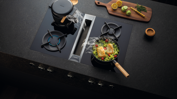 Il sistema di aspirazione per piano cottura BORA Professional 3.0 si integra perfettamente con la struttura raffinata di una cucina impiallacciata. Combina la massima funzionalità con un design elegante, per un aspetto complessivo armonioso.