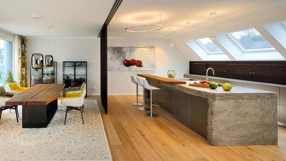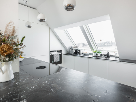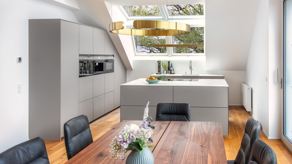 Trasformate le sfide architettoniche in un vero potenziale di design e sfruttate ogni centimetro della vostra cucina in mansarda. I nostri rivenditori specializzati vi supporteranno.