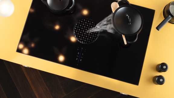 De afzuiging en het kookveld zijn volledig vlak met het werkblad ingebouwd. De afzuiging zit verborgen onder de iconische instroomsproeier met staafjes in een facetgeslepen look. De expressieve lijnvoering en de instroomsproeier, gehuld in diepzwart, kenmerken het markante design.